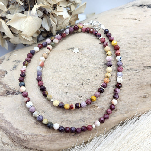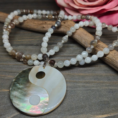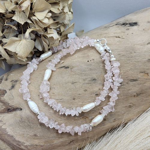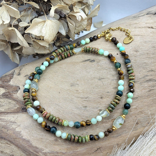 kurze Halskette Rosenquarz / Mondstein / Prehnit / Perle