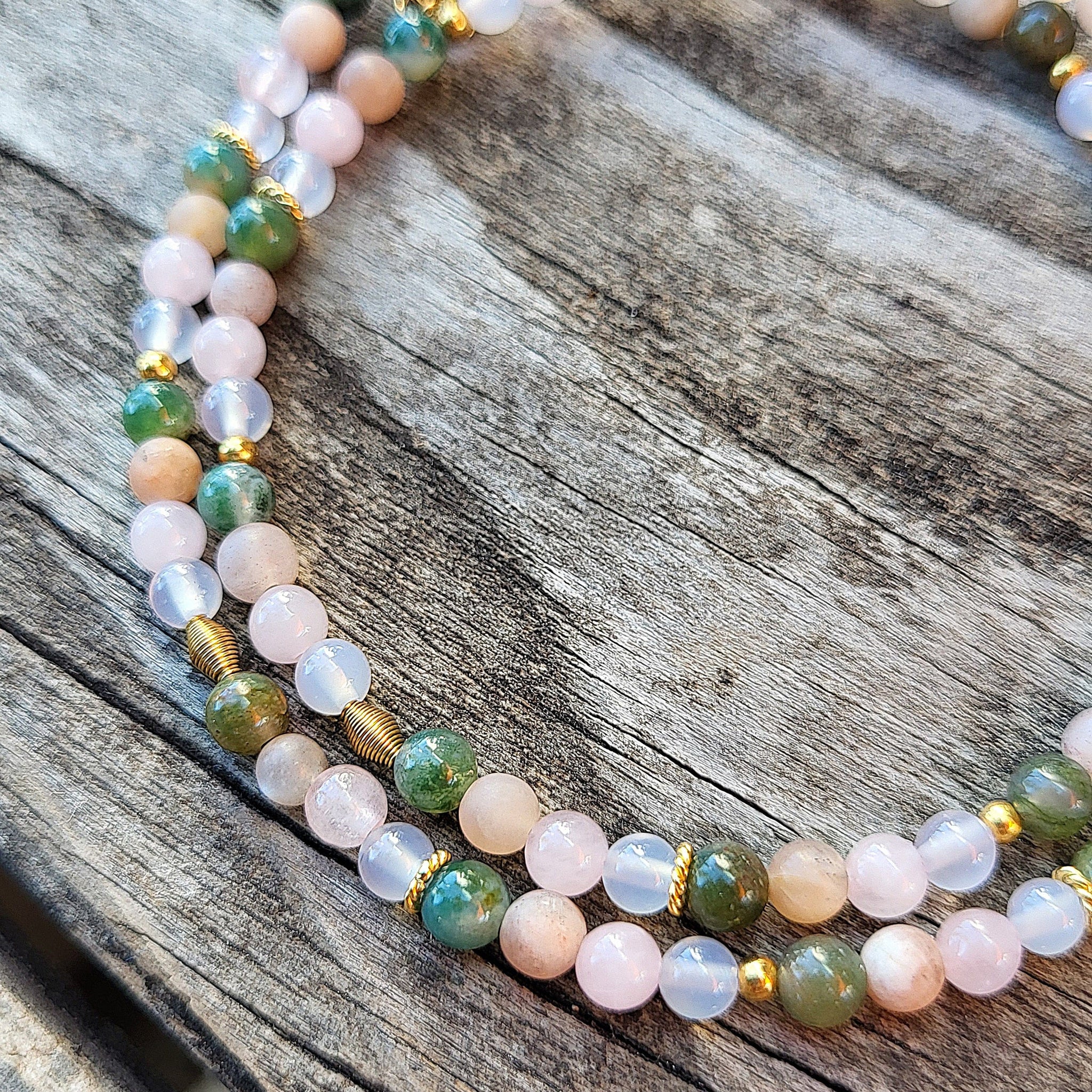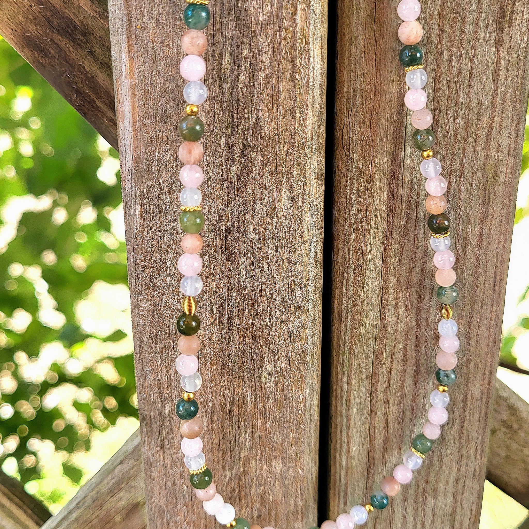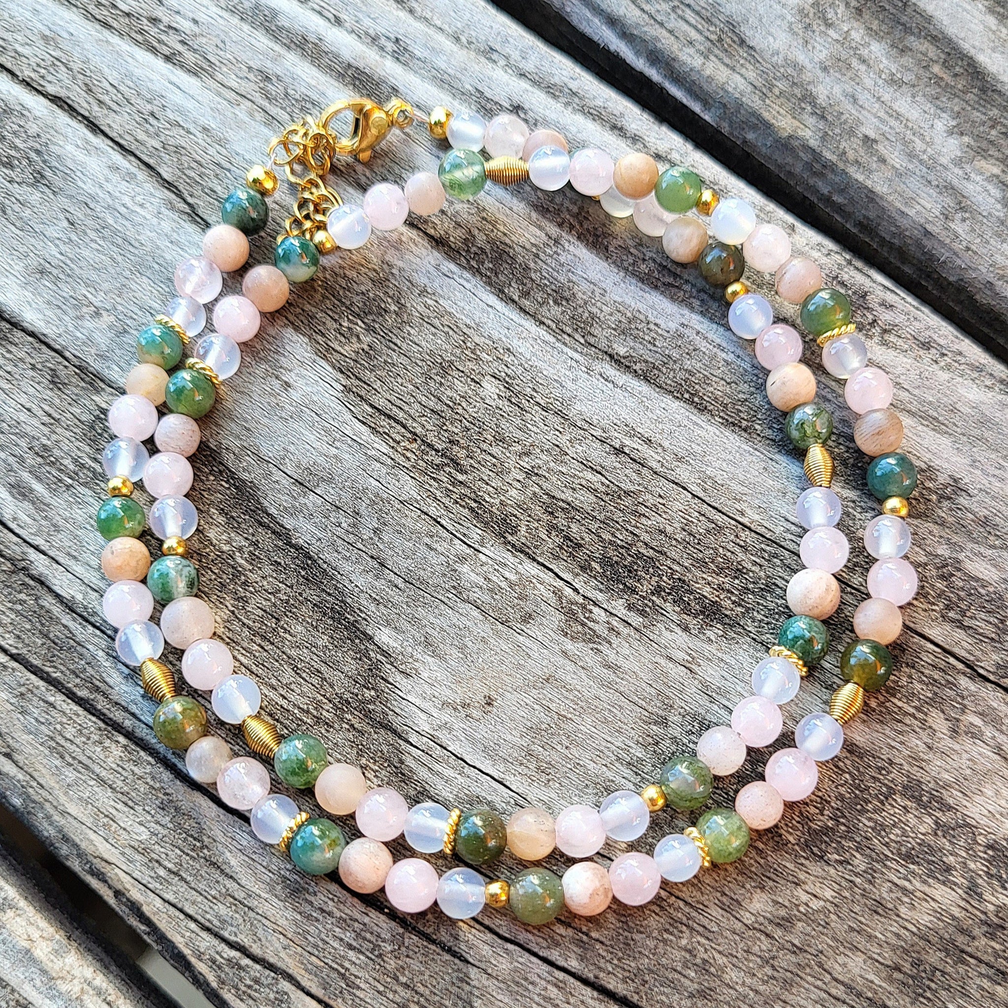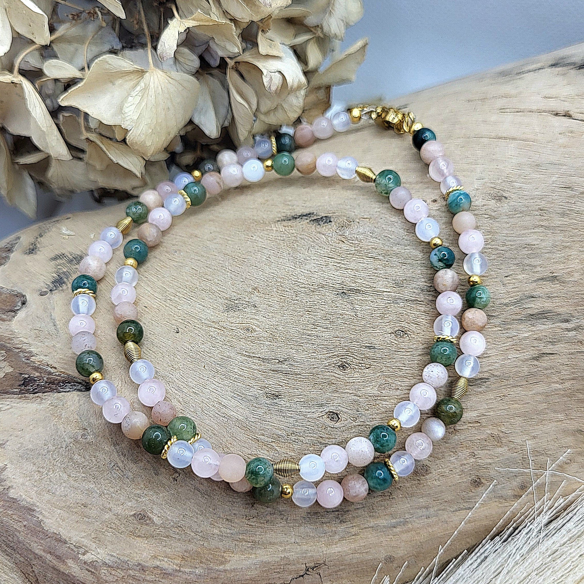 Die Halskette haben wir aus Rosenquarz, Mondstein, Achat und Moosachat Edelsteinen (4mm) und vielen Zwischenstücken aus vergoldetem Silber und Edelstahl kreiert. Die Halskette ist auf Schmuckdraht aufgezogen und hat eine Verlängerungskette.