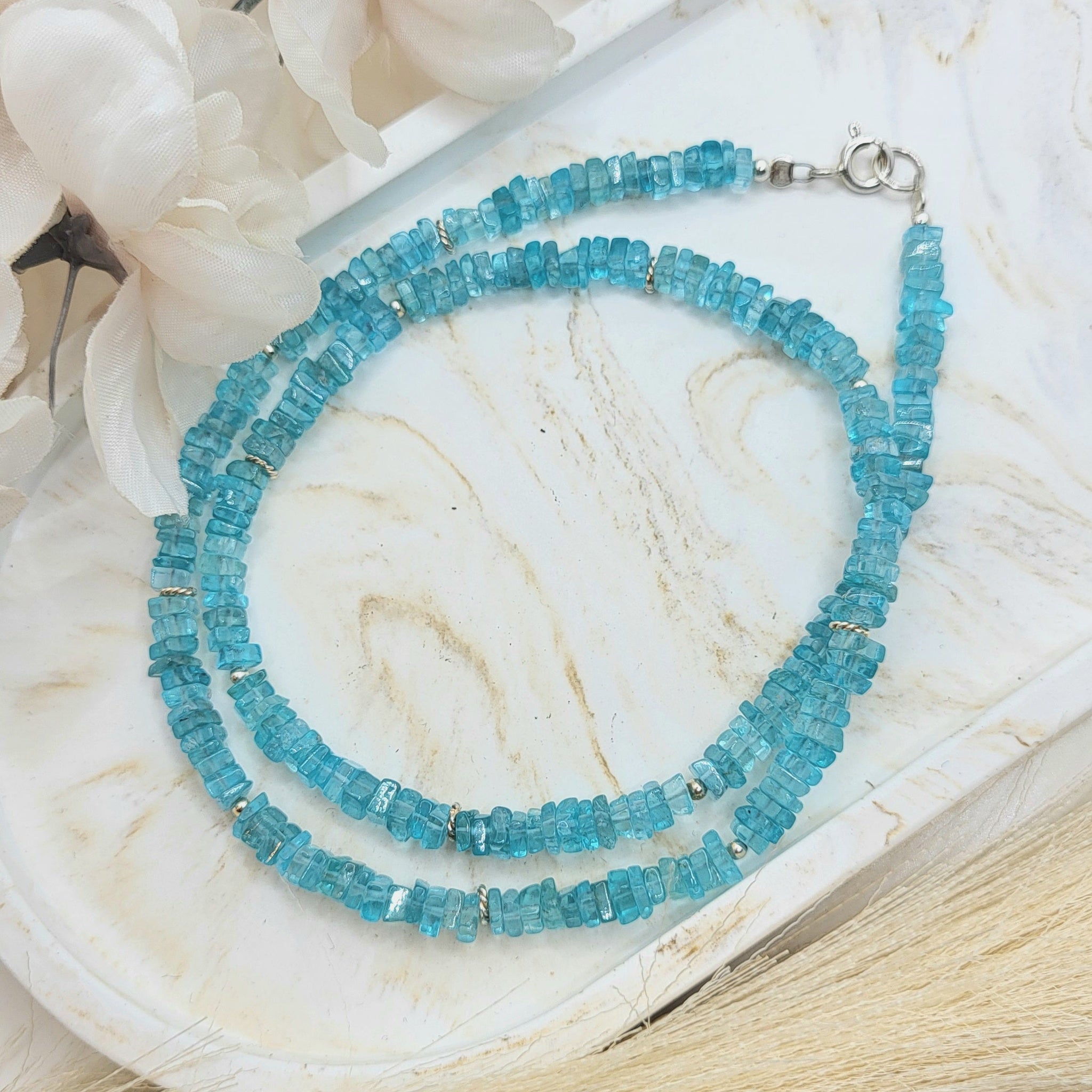 Die Halskette haben wir aus Apatit Edelsteinen (4mm) und vielen Zwischenstücken aus 925 Silber kreiert. Die Halskette ist auf Schmuckdraht aufgezogen.