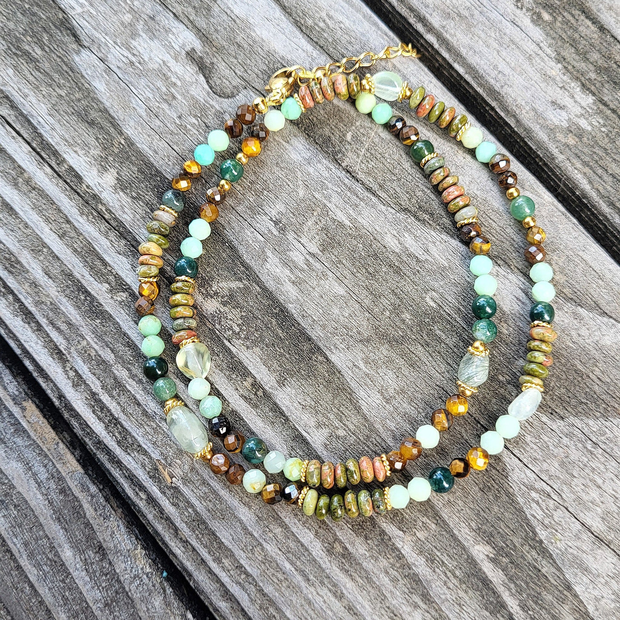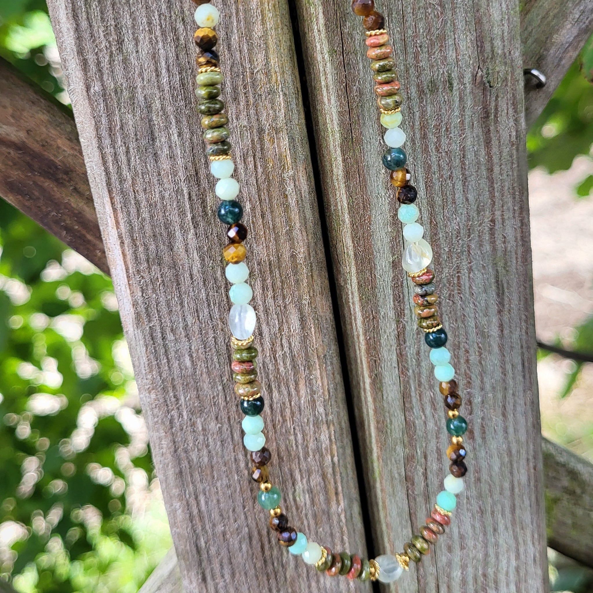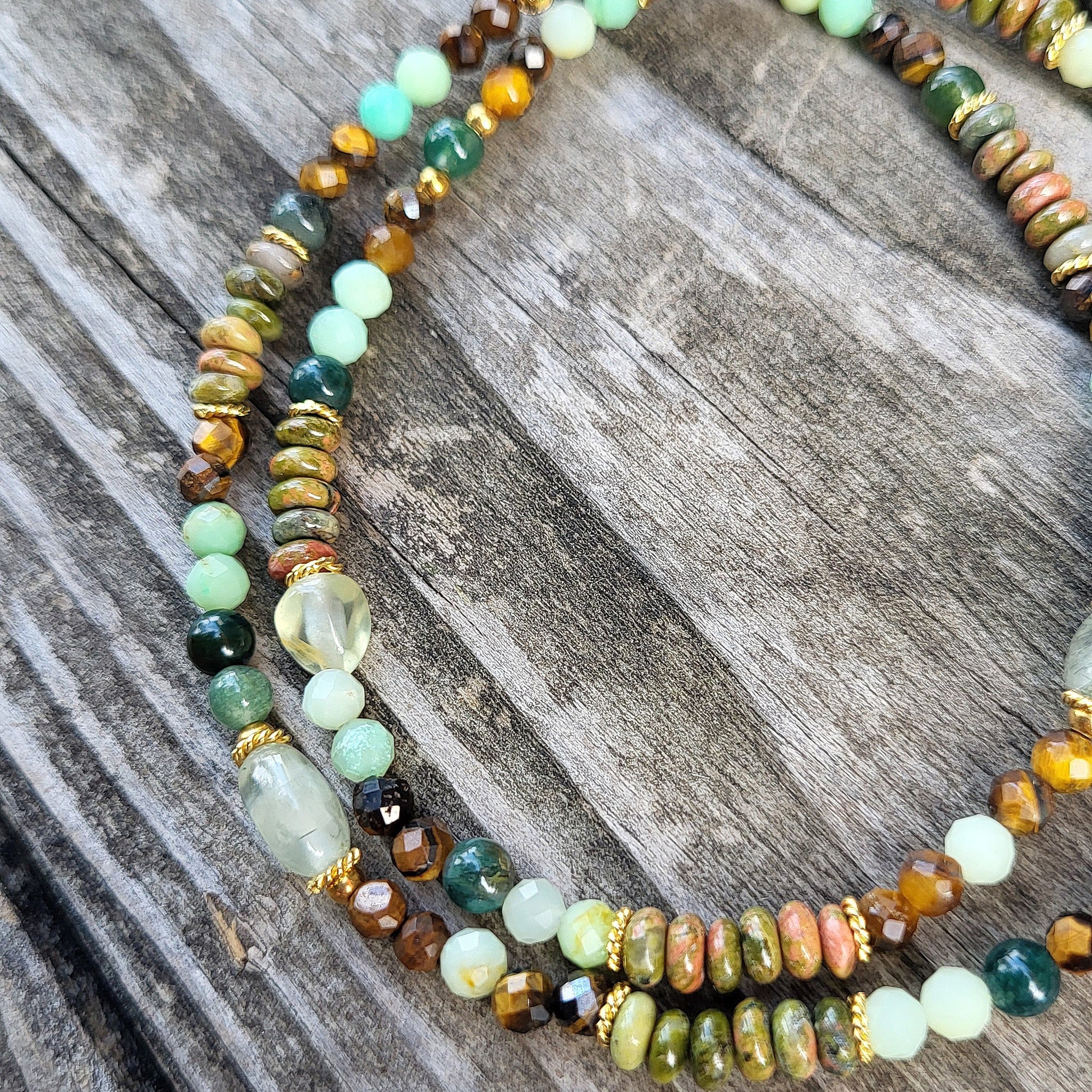 Die Halskette haben wir aus Unakit, Prehnit, Tigerauge und Chrysopras Edelsteinen (4mm) und vielen Zwischenstücken aus vergoldetem Silber und Edelstahl kreiert. Die Halskette ist auf Schmuckdraht aufgezogen und hat eine Verlängerungskette.
