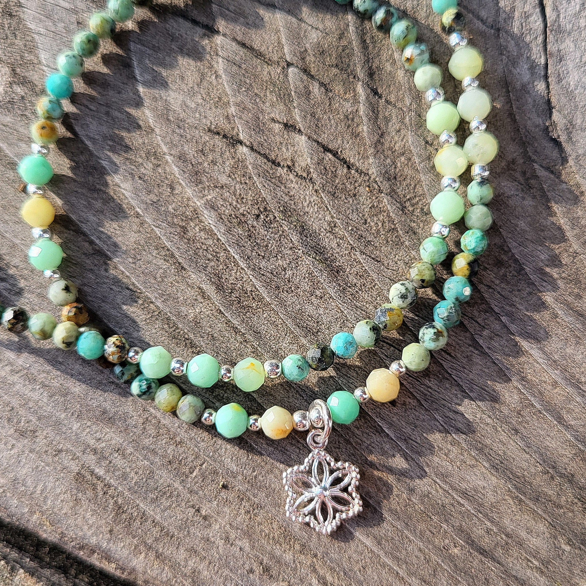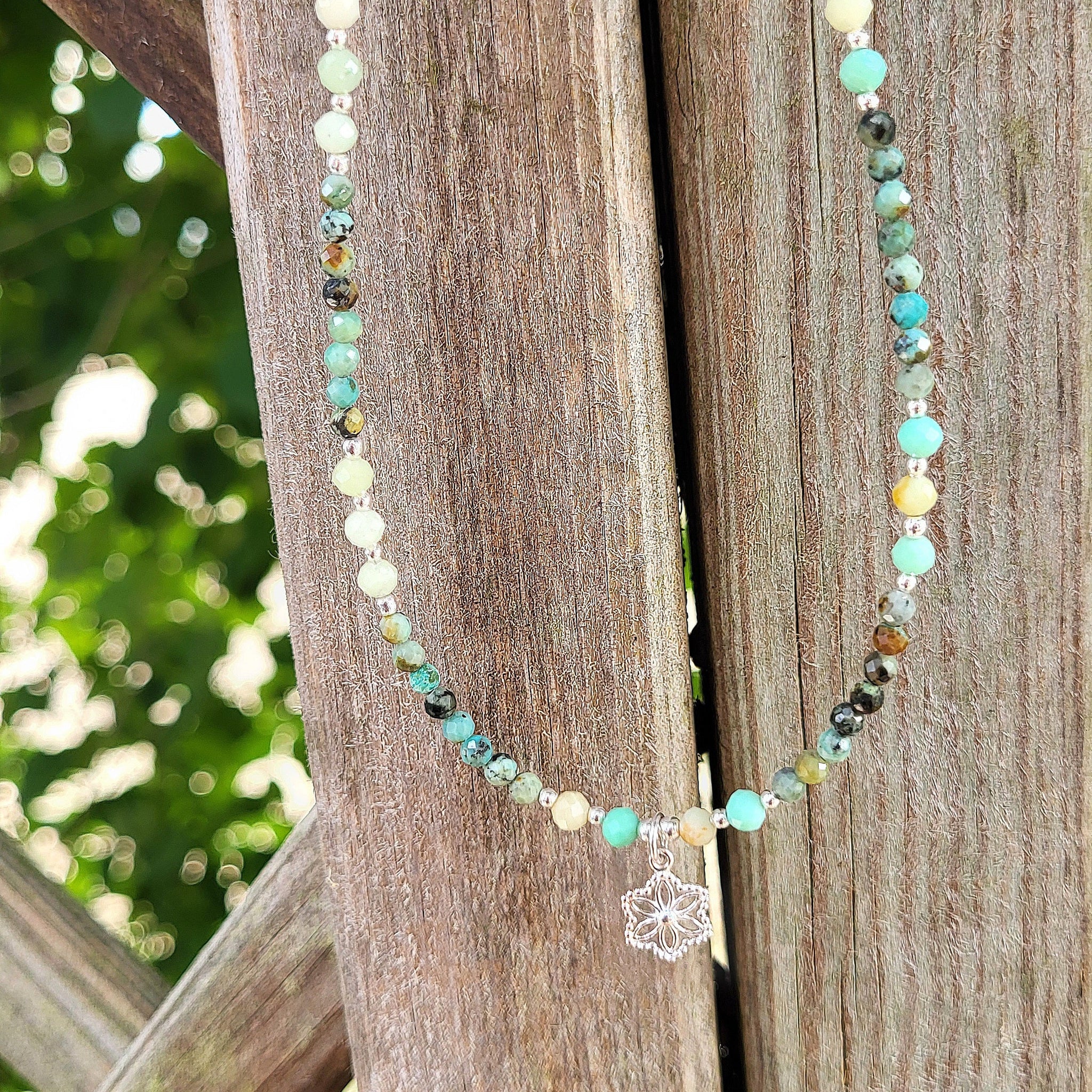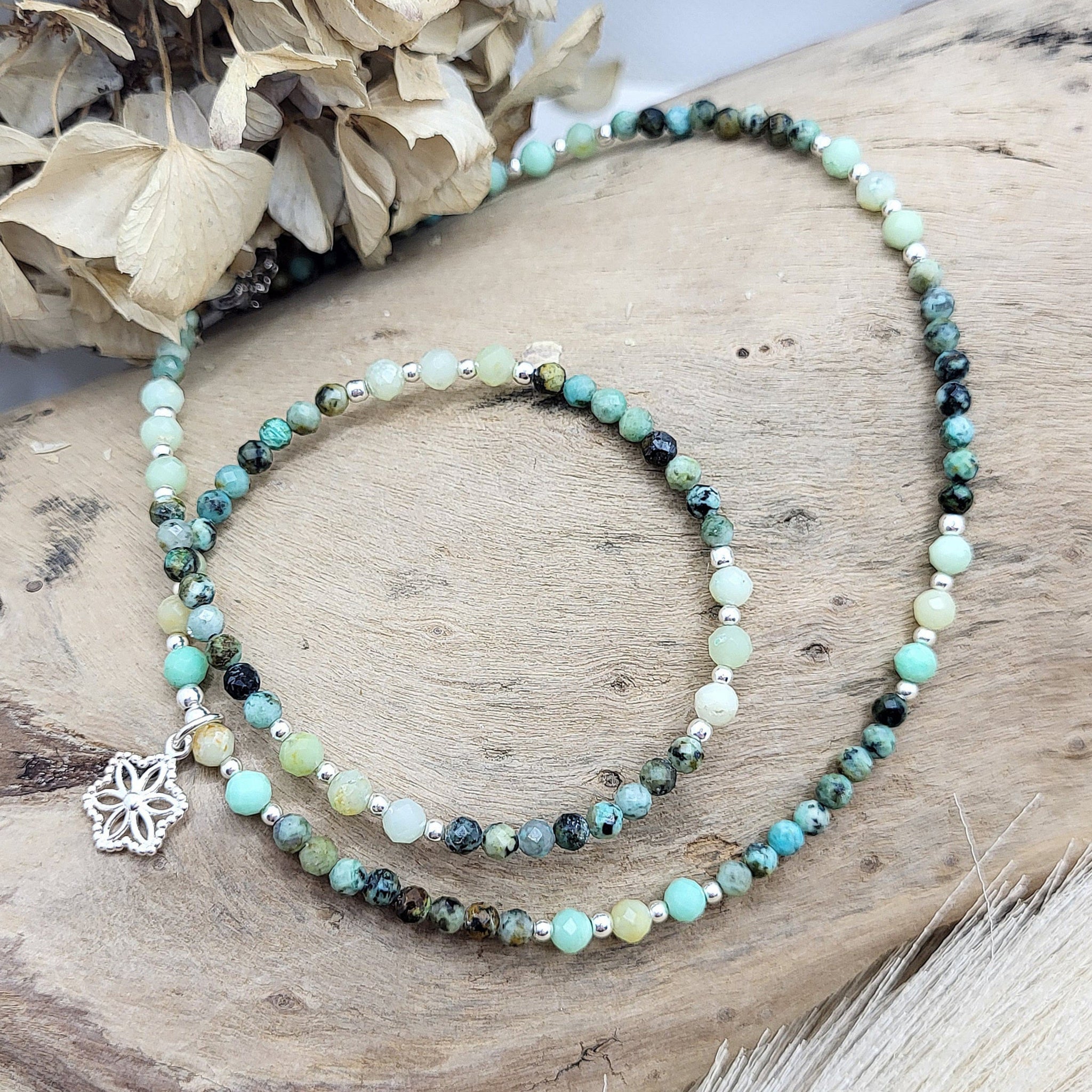Die Halskette haben wir aus facettierten Türkis und Chrysopras Edelsteinen (3mm) und vielen Zwischenstücken aus 925 Silber kreiert. Die Halskette ist auf Schmuckdraht aufgezogen und hat eine Verlängerungskette zum einstellen der Grösse.