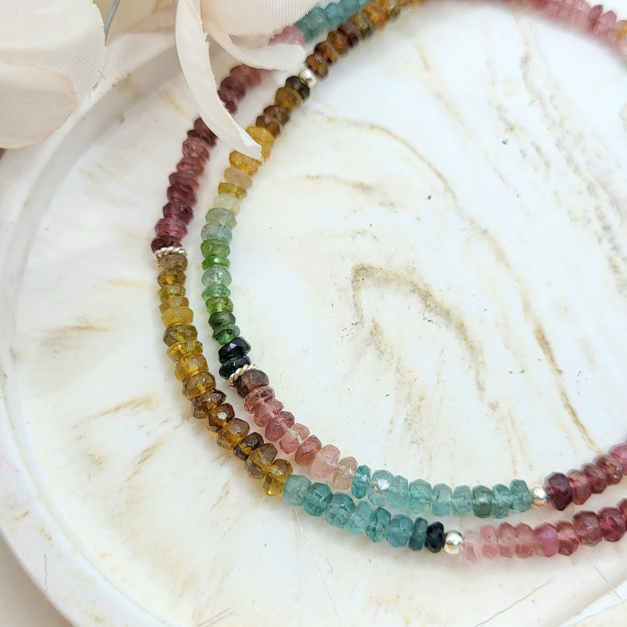 Die kurze Halskette besteht aus 3.8mm Turmalin Edelsteinen sowie 925 Silber Zwischenteile.