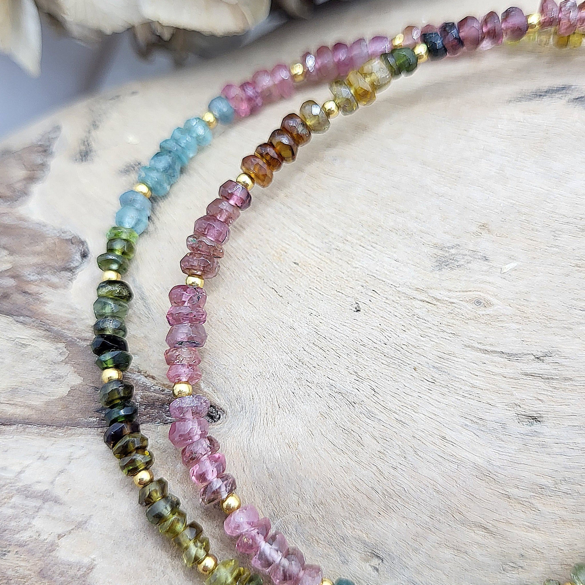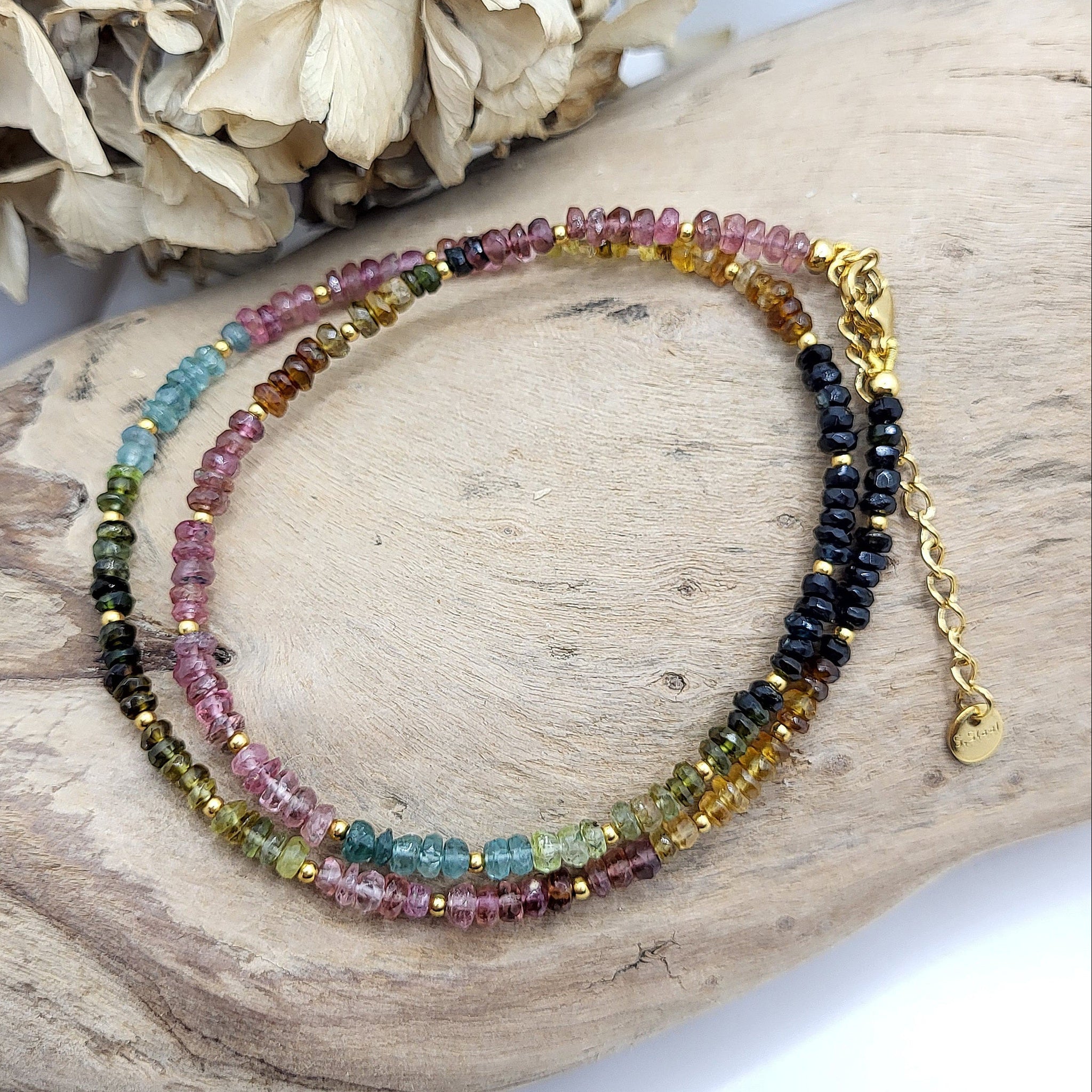 Die kurze Halskette besteht aus 3mm Turmalin Edelsteinen sowie 18k pvd vergoldete Edelstahl Zwischenteile.